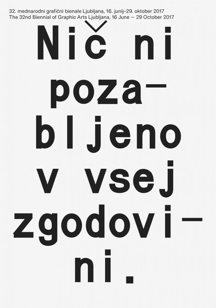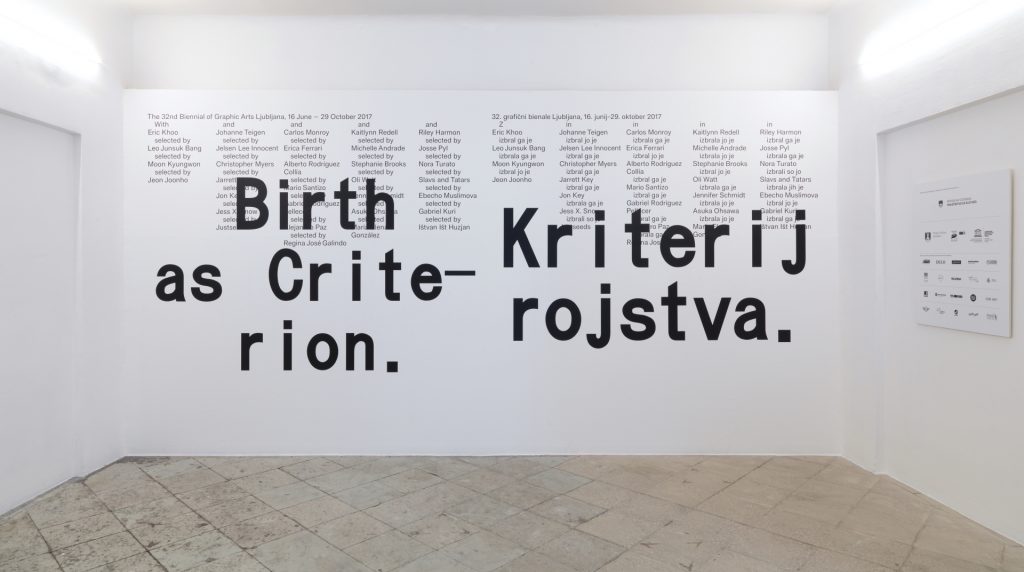 32. izdaja grafičnega bienala je v sodelovanju s številnimi partnerji prinesla obsežen sklop razstav in dogodkov. Izbor umetnikov za osrednjo bienalsko razstavo z naslovom Kriterij rojstva, ki je bila na ogled v MGLC (v Gradu Tivoli in v prenovljeni stavbi Švicarije), je sledil zanimivemu eksperimentu. Šlo je za preprost mehanizem: prejemniki velike nagrade z zadnjih petih bienalov – Joonho Jeon (2007), kolektiv Justseeds (2009), Regina José Galindo (2011), María Elena González (2013) in Ištvan Išt Huzjan (2015) – so bili povabljeni, naj predlagajo po enega umetnika, ki bo sodeloval na tokratnem dogodku; ti so bili nato povabljeni, naj imenujejo naslednjih pet sodelujočih umetnikov. Proces je obsegal še pet krogov in na koncu 32. bienale oskrbel z imeni okoli tridesetih sodelujočih umetnikov.