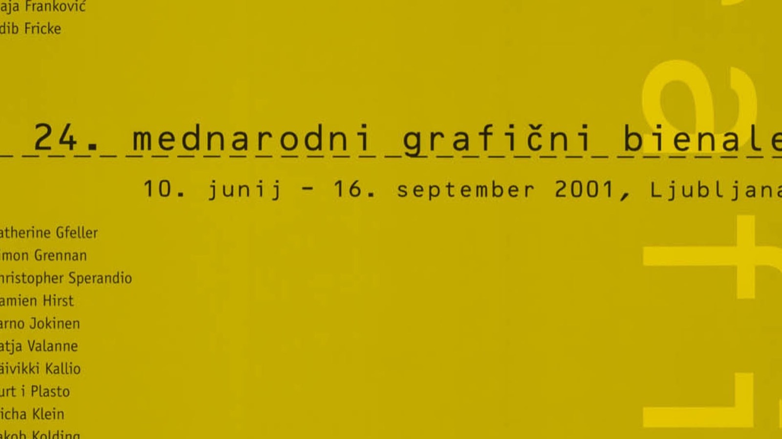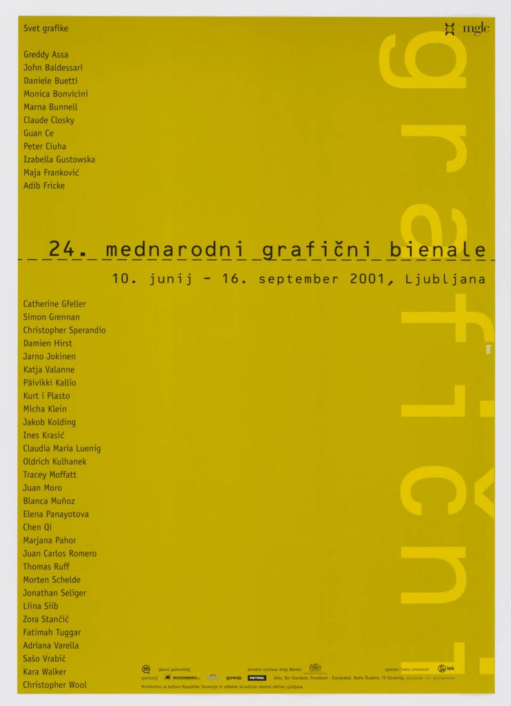 The 24th International Biennial of Graphic Arts was marked by some changes, with emphasis placed on the substance of the graphic arts within the context of emerging global art, the crossing of the physical boundaries of the event venue (it simultaneously takes place at locations outside Ljubljana, abroad, in the media, on billboard posters and public digital displays) and a new internal organisational structure. The mentioned execution of the event marks a turning point in the history of the Biennial of Graphic Arts, its radical modification and revitalisation. The subject matter underscored the artistic, social, political and economic importance of visual information and the pictorial image that can be exactly reproduced and circulated by the masses, with the four exhibition sections highlighting the different elements of contemporary art in terms of content.