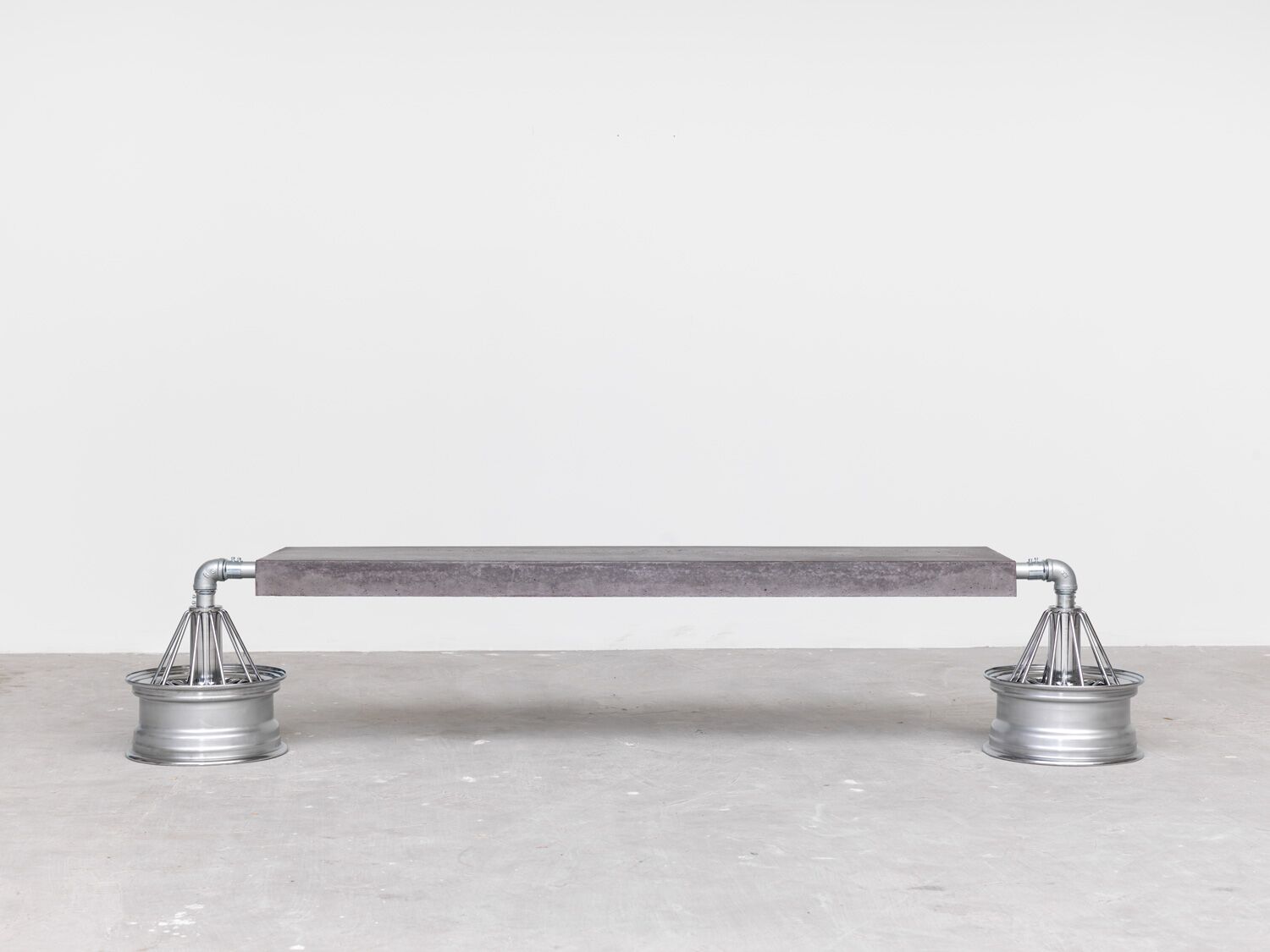 Dozie Kanu, Bench on 84’s, 2017; poured concrete, steel, rims; 52.07×45.72×254 cm.