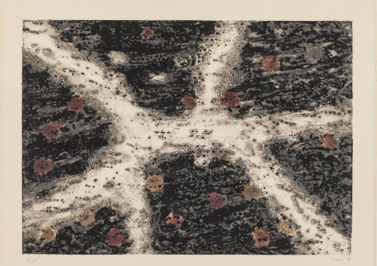 Zoran Mušič, Dalmatian Land, 1959, colour aquatint; recipient of the Grand Prix d’Honneur, 14th International Biennial of Graphic Arts, Ljubljana, 1981.
